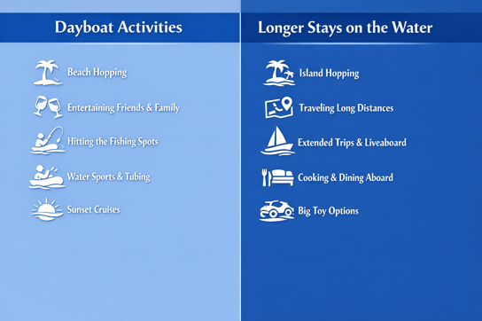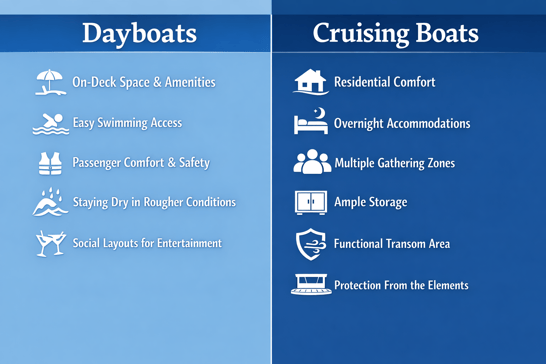 If your desired activities match the left, you may be in the market for a dayboat. If they align more with the right, a cruising or livable vessel may be best. Here is a side-by-side of some of the different amenities: